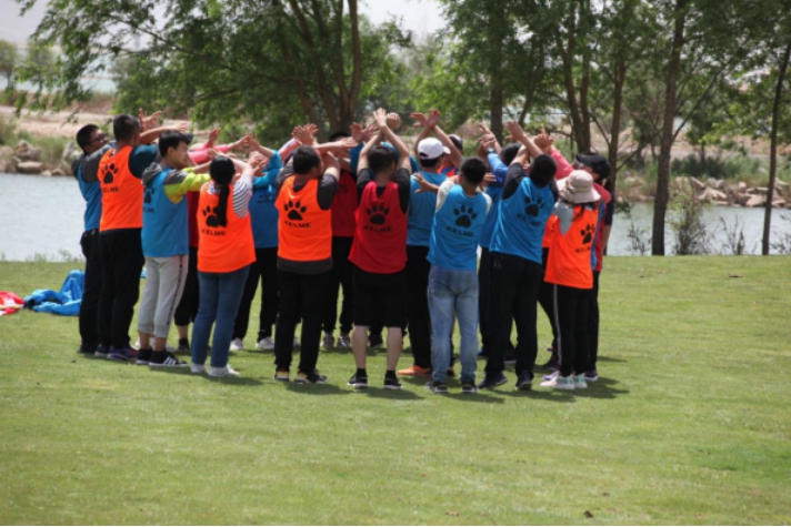 在藍天白云與綠茵鮮花相互映襯著的自然風景下,戶外拓展活動正式拉開了序幕。40余名職工分成四組,取隊名、定隊號、定隊歌及設(shè)計隊旗并且用獨特的方式展示出來。