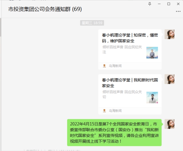 2022年4月15日是第7個(gè)全民國(guó)家安全教育日,4月7日上午,市城投集團(tuán)公司通過(guò)多種形式組織職工觀看了市委宣傳部聯(lián)合市委辦公室(國(guó)安辦)推出的“我和新時(shí)代國(guó)家安全”、“知密碼、懂密碼,維護(hù)國(guó)家安全”系列宣傳視頻。