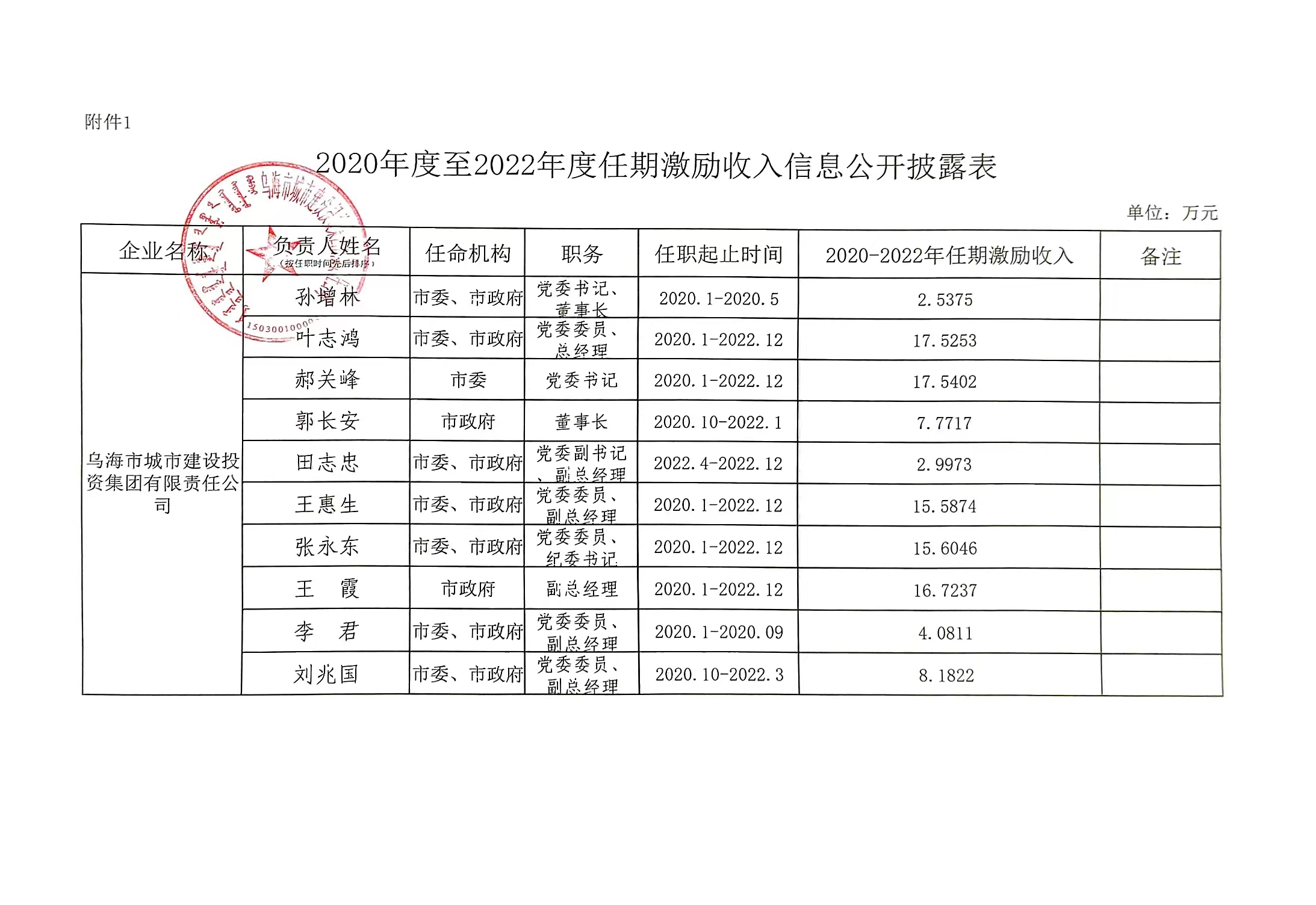 烏海市城市建設(shè)投資集團有限責(zé)任公司企業(yè)負責(zé)人2020年度至2022年度任期激收入信息公開披露表