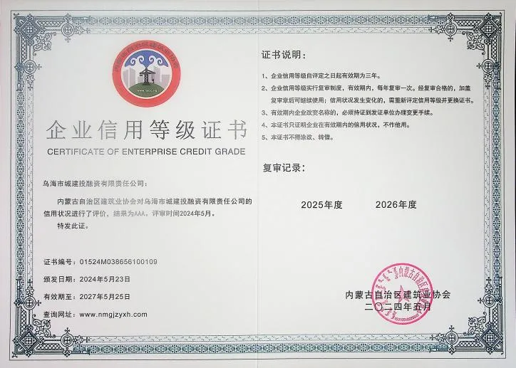 近日,經(jīng)內(nèi)蒙古自治區(qū)建筑業(yè)協(xié)會(huì)評(píng)選,烏海市城建投融資有限責(zé)任公司成功榮獲《2024年度內(nèi)蒙古自治區(qū)建筑業(yè)AAA級(jí)信用企業(yè)》稱(chēng)號(hào)。此項(xiàng)殊榮的獲得,是對(duì)城建公司長(zhǎng)期以來(lái)在建筑業(yè)領(lǐng)域誠(chéng)信經(jīng)營(yíng)、規(guī)范管理的充分肯定。