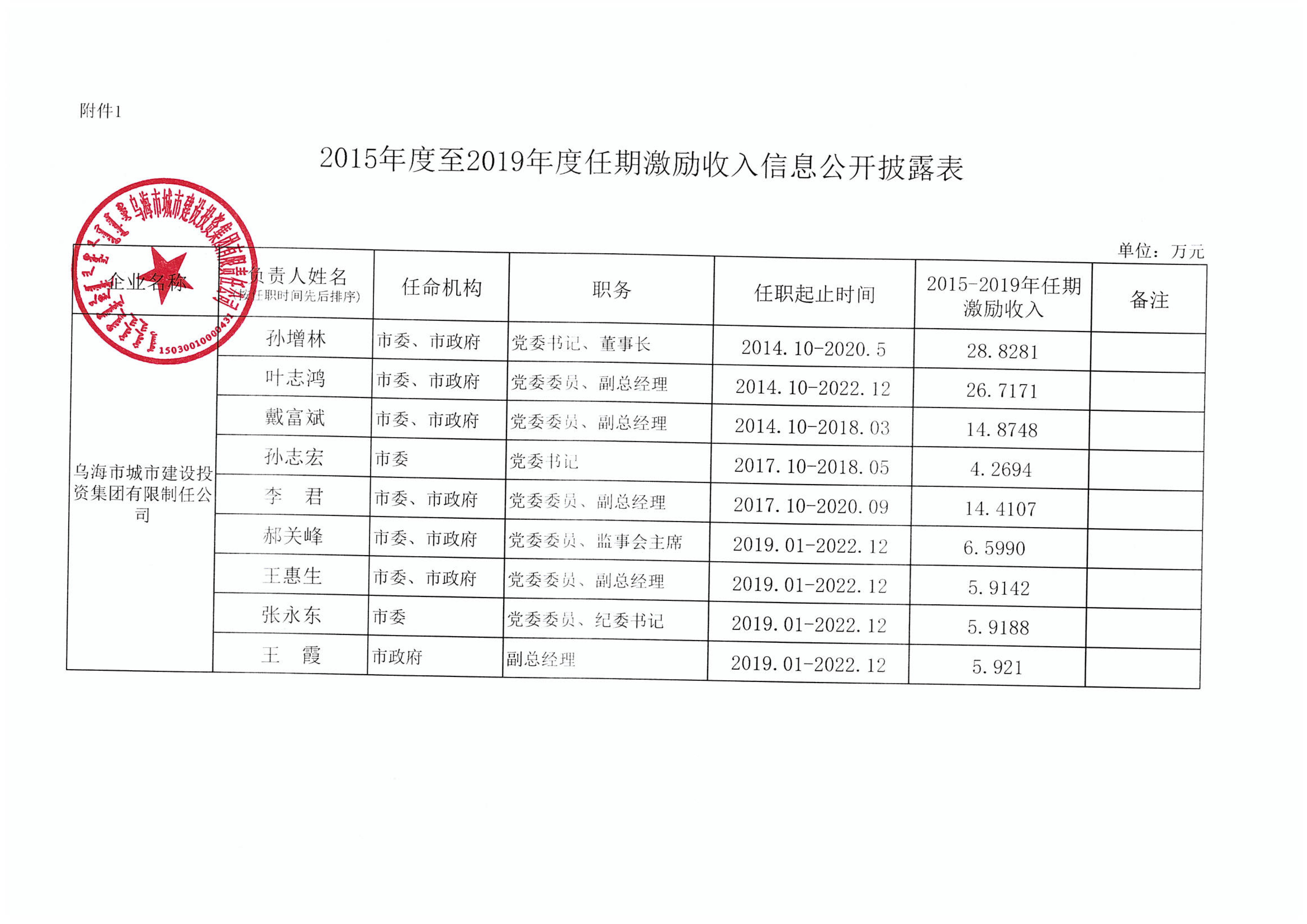 烏海市城市建設(shè)投資集團有限責(zé)任公司2015年度至2019年度任期激勵收入信息公開披露表