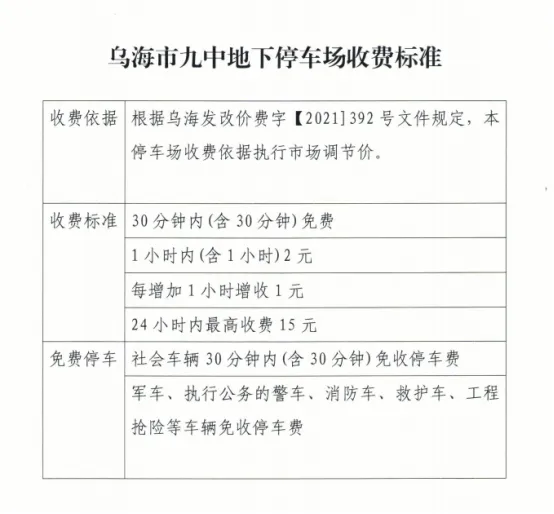 為緩解地面停車壓力,引導(dǎo)車輛有序停放,烏海市濱河九中地下停車場與麗晶國際酒店地下停車場已完成智能化升級改造。2024年7月25日經(jīng)海勃灣區(qū)城市管理綜合執(zhí)法局批準(zhǔn),兩個停車場于近期正式開展停車收費(fèi)管理,收費(fèi)標(biāo)準(zhǔn)見下表: