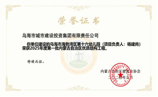 近日,市城投集團公司代建實施的烏海市海勃灣區(qū)第十六幼兒園項目,榮獲2025年度第一批內(nèi)蒙古自治區(qū)優(yōu)質(zhì)結(jié)構(gòu)工程。